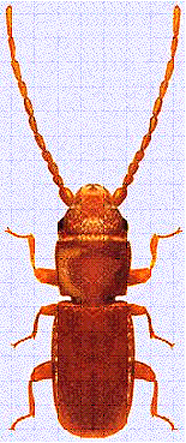 體長1.4 -2.2mm,寬 0.5 - 0.7mm。體極扁平,暗褐色至暗赤褐色。頭部背方有 1 條后橫脊;雄蟲上顎側(cè)緣無齒;觸角長,雄蟲觸角長為體長的 3/4,末 3 節(jié)長而兩側(cè)近平行,雌蟲觸角約為體長之半,且觸角節(jié)較粗,近念珠狀。前胸背板寬為長的1.2~1.3倍,兩側(cè)向后不顯著狹縮,前角圓而后角稍尖。鞘翅長不大于其總寬的1.75 倍,第1、2 行間有 4 縱列剛毛。雄性外生殖器的 2 塊附骨片下方的一片骨化弱;雌性交配囊骨片在一端強(qiáng)烈彎曲。